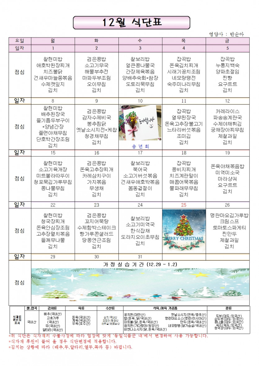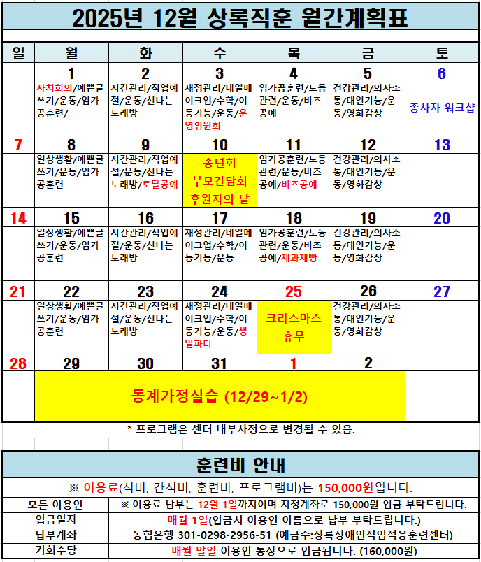 2025년 12월 일정표/식단표 페이지 정보 작성자 이현희 댓글 댓글 0건 조회Hit 208회 작성일Date 25-11-27 18:15 본문 2025년 12월 일정표/식단표 입니다. 목록 이전글상록장애인직업적응훈련센터 2026년 예산서 25.12.26 다음글2025년 11월 일정표/식단표 25.11.03 댓글 0 댓글목록 등록된 댓글이 없습니다.