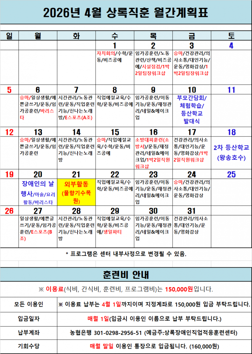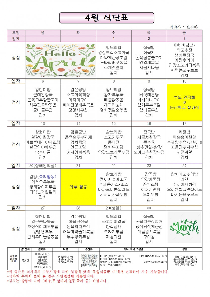 2026년 4월 일정표/식단표 페이지 정보 작성자 이현희 댓글 댓글 0건 조회Hit 112회 작성일Date 26-03-30 13:52 본문 2026년 4월 일정표/식단표 입니다. 목록 이전글2026년 5월 일정표/식단표 26.04.29 다음글2026년 3월 일정표/식단표 26.02.25 댓글 0 댓글목록 등록된 댓글이 없습니다.