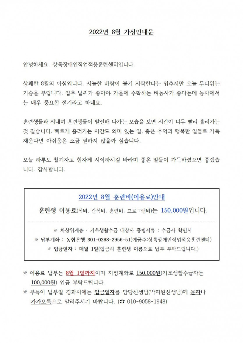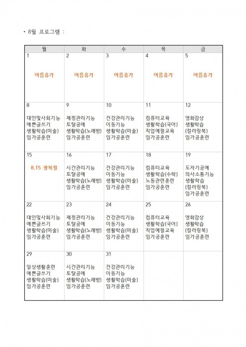 2022년 8월 일정표 페이지 정보 작성자 박지원 댓글 댓글 0건 조회Hit 201회 작성일Date 22-07-25 18:55 본문 2022년 8월 일정표 입니다. 목록 이전글2022년 9월 일정표 22.08.22 다음글2021년 상록장애인직업적응훈련센터 결산서 22.02.11 댓글 0 댓글목록 등록된 댓글이 없습니다.