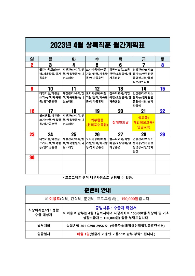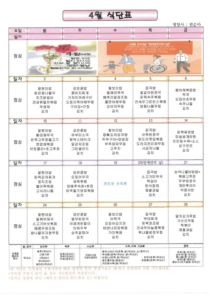 2023년 4월 일정표/식단표 페이지 정보 작성자 박지원 댓글 댓글 0건 조회Hit 300회 작성일Date 23-03-27 16:36 본문 2023년 4월 일정표와 식단표 입니다. 목록 이전글2023년 5월 일정표/식단표 23.04.24 다음글2023년 3월 일정표 23.02.27 댓글 0 댓글목록 등록된 댓글이 없습니다.