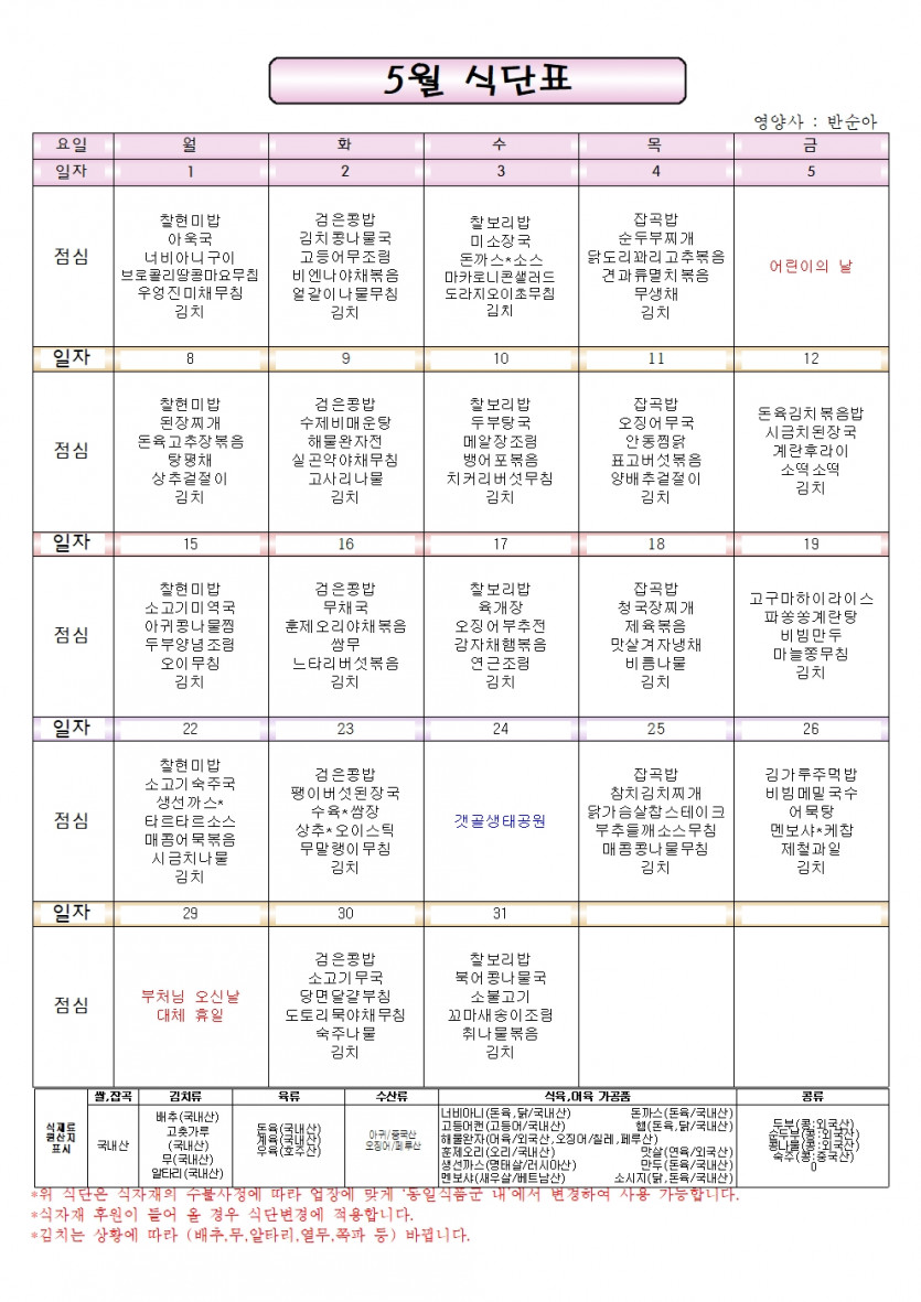 2023년 5월 일정표/식단표 페이지 정보 작성자 박지원 댓글 댓글 0건 조회Hit 178회 작성일Date 23-04-24 16:12 본문 2023년 5월 일정표와 식단표 입니다. 목록 이전글2023년 6월 일정표/식단표 23.05.22 다음글2023년 4월 일정표/식단표 23.03.27 댓글 0 댓글목록 등록된 댓글이 없습니다.