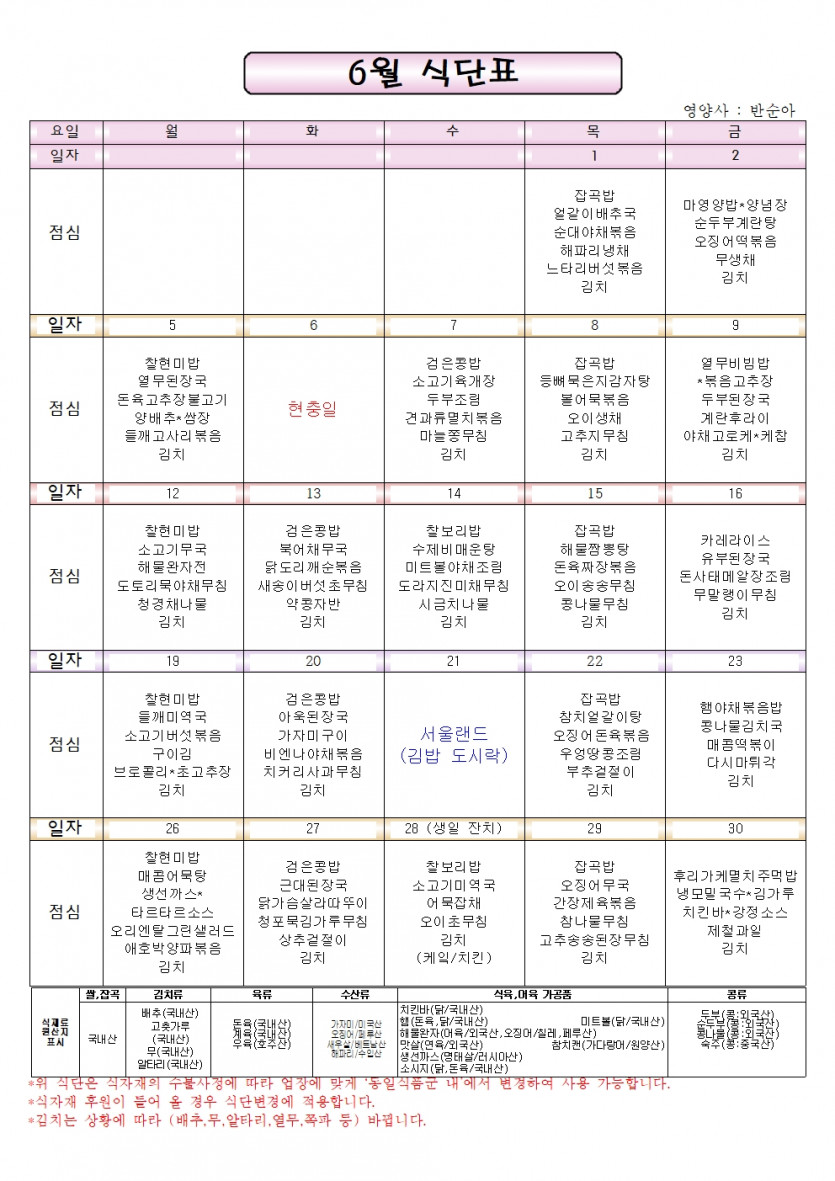 2023년 6월 일정표/식단표 페이지 정보 작성자 박지원 댓글 댓글 0건 조회Hit 217회 작성일Date 23-05-22 16:37 본문 2023년 6월 일정표와 식단표 입니다. 목록 이전글2023년 7월 일정표/식단표 23.06.26 다음글2023년 5월 일정표/식단표 23.04.24 댓글 0 댓글목록 등록된 댓글이 없습니다.