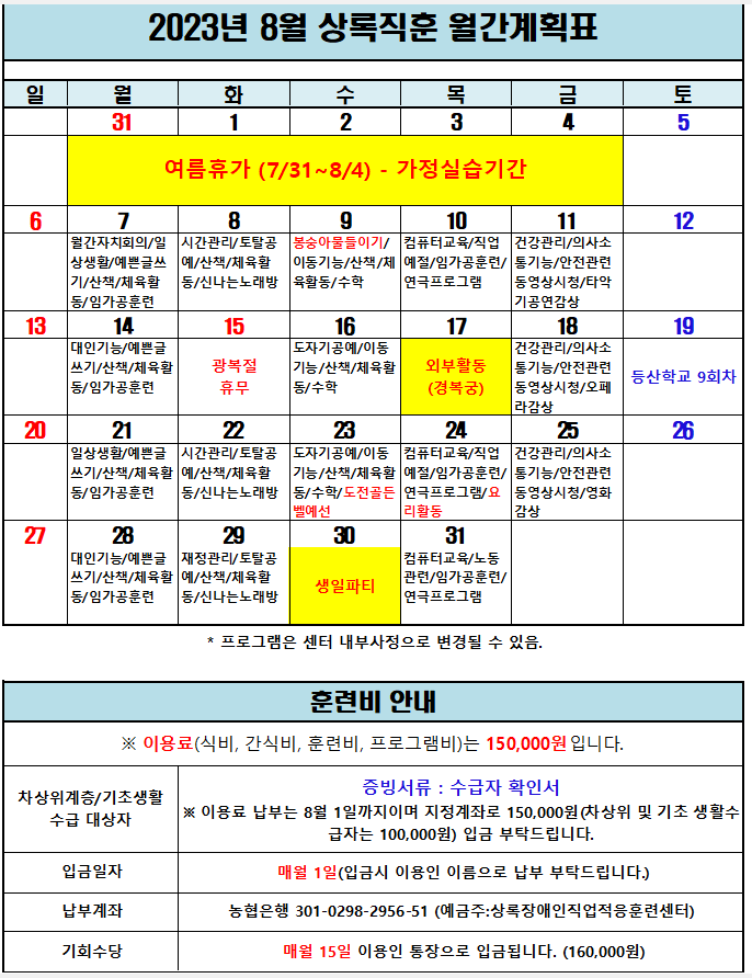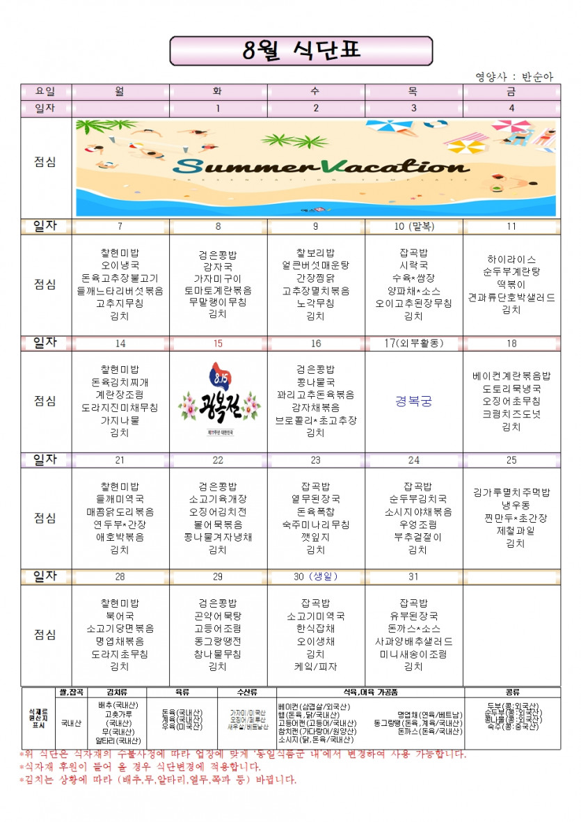 2023년 8월 일정표/식단표 페이지 정보 작성자 박지원 댓글 댓글 0건 조회Hit 168회 작성일Date 23-07-24 16:37 본문 2023년 8월 일정표와 식단표 입니다. 목록 이전글2023년 9월 일정표/식단표 23.08.21 다음글2023년 7월 일정표/식단표 23.06.26 댓글 0 댓글목록 등록된 댓글이 없습니다.