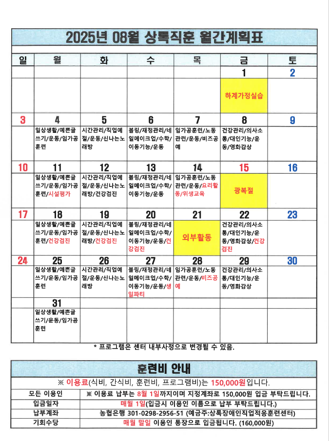 2025년 8월 일정표와 식단표 입니다.